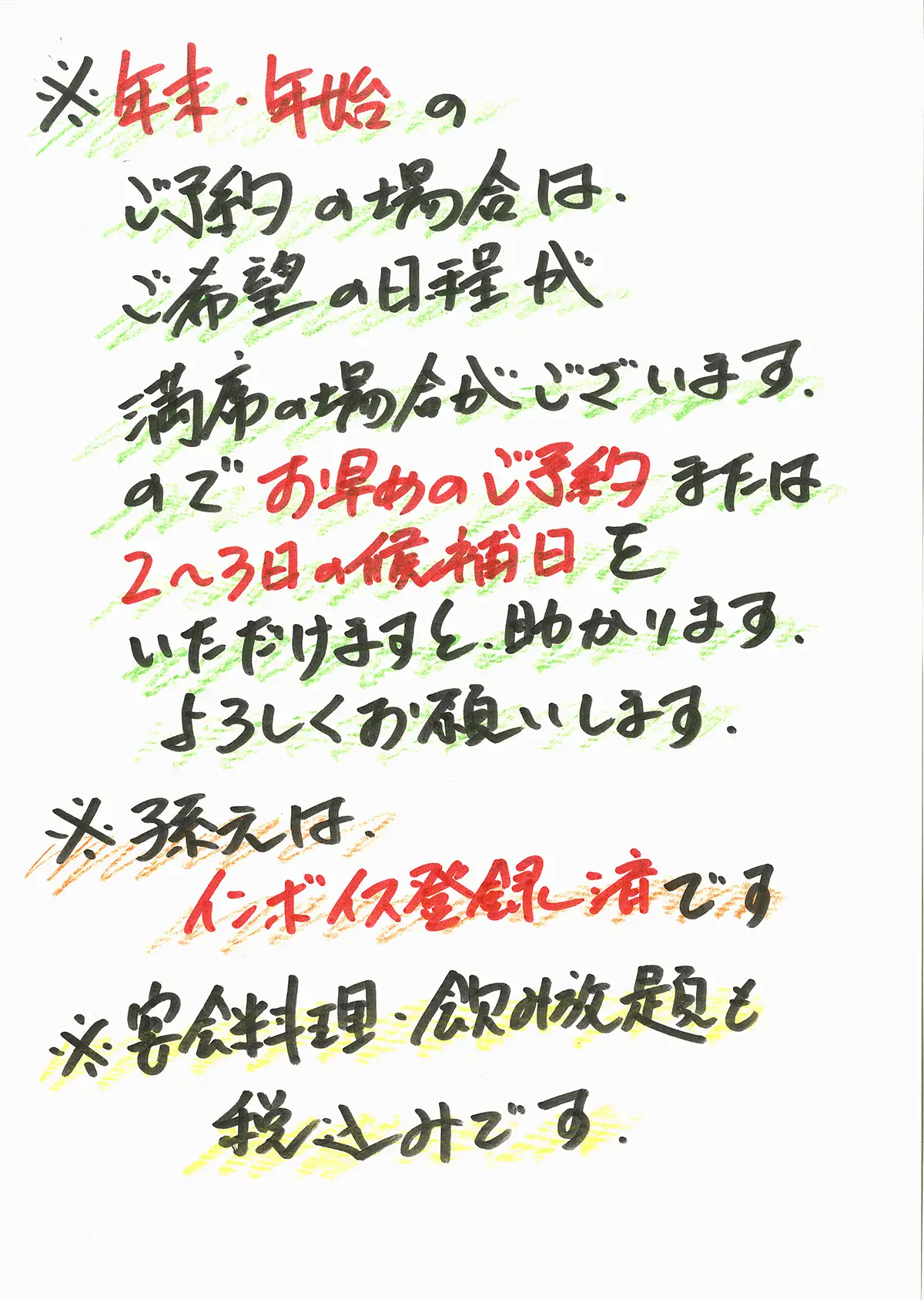 その他、各クレジットカード各交通系カード、電子マネー、Pay関連のお支払方法をご利用いただけます。使用可能なお支払方法はお電話にてお問い合わせください。 |